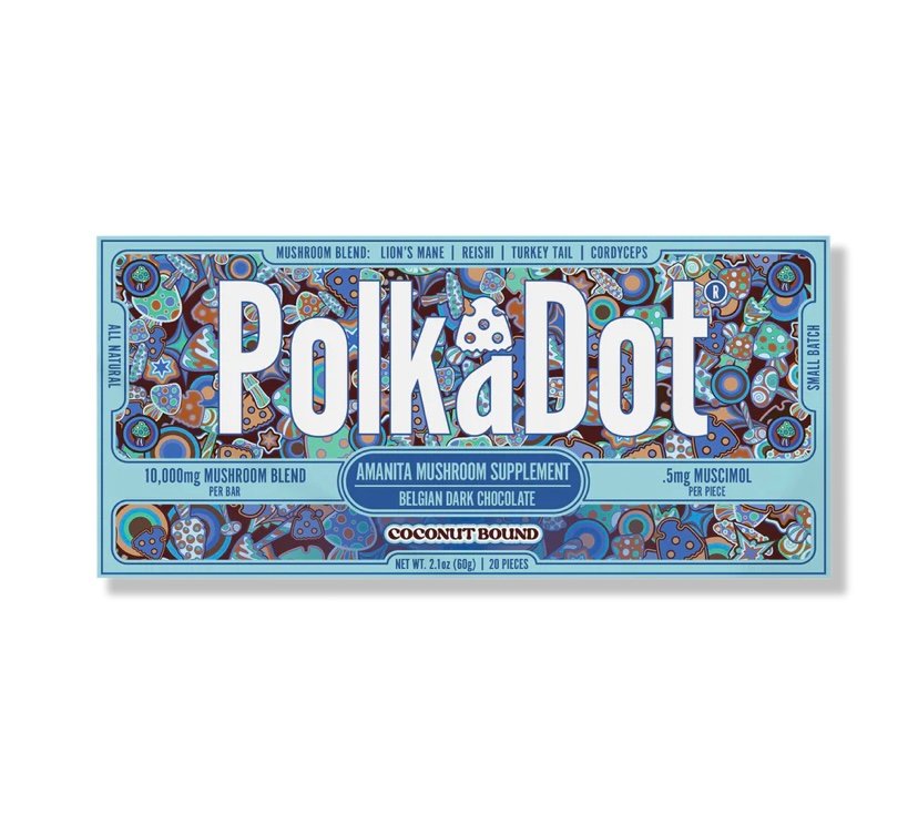 Discover the Coconut Bound PolkaDot Magic Mushroom Belgian White Chocolate—a luscious fusion of smooth Belgian white chocolate, the tropical allure of coconut, and the gentle magic of mushrooms for a truly enchanting experience.
